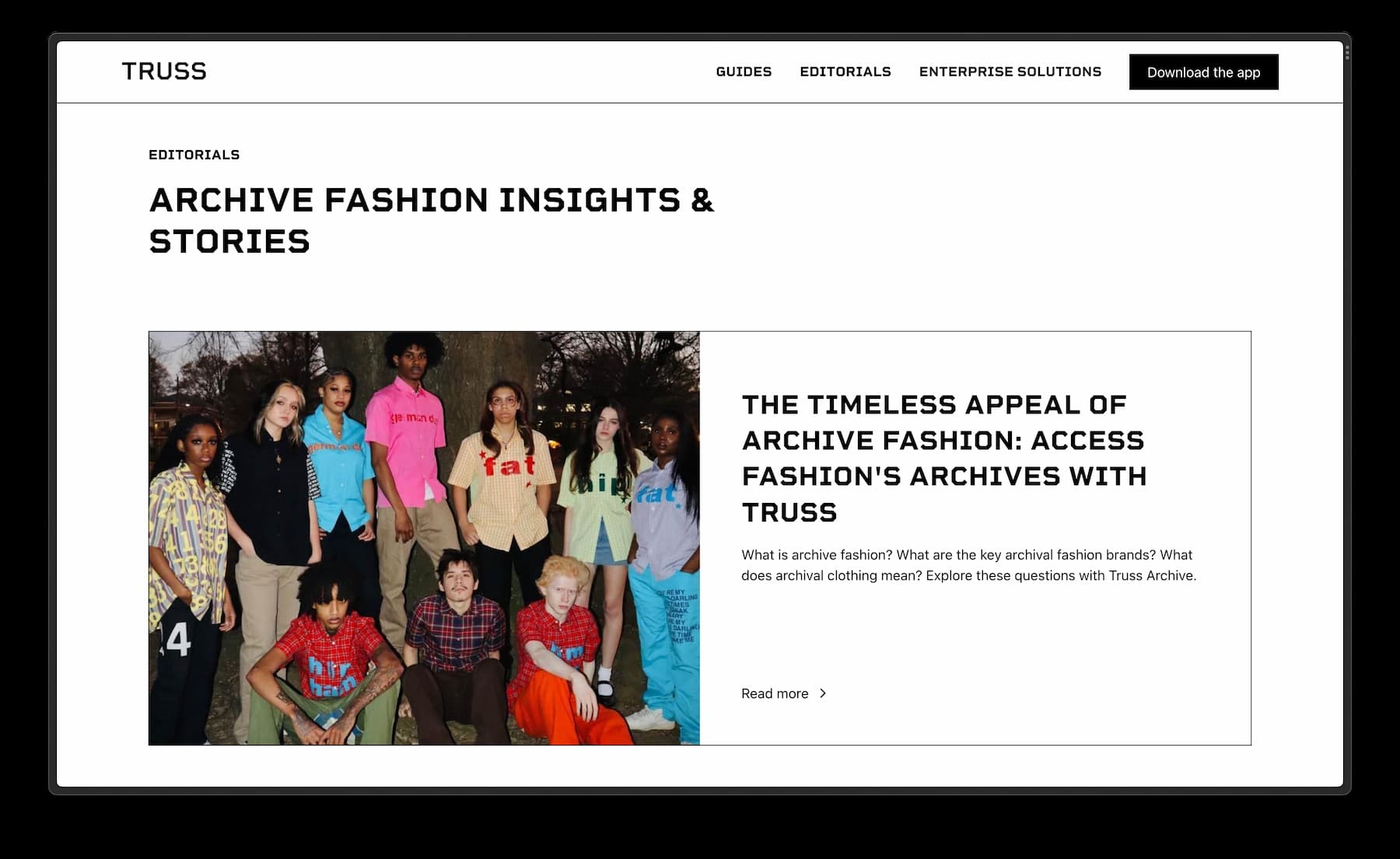 Discover and purchase curated Archive & Luxury fashion from top resale stores. Find the finest luxury fashion from around the web. TRUSS’ platform uses proprietary AI that aggregates visual, textual and financial data to locate and compare information for garments listed online. With over 50M items in the database, we provide insights into trends, authenticity, sales history and listings available online for hundreds of apparel categories including handbags and sneakers.
